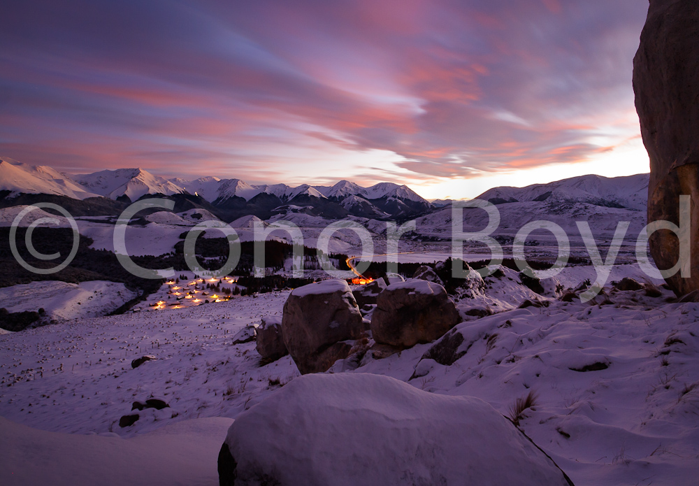 There were a couple of large snowfalls in June 2012 (including 90cm on 6th June) with some very low temperatures at times.  It was -9 on the morning I headed up to the bouldering area known as Wuthering Heights on Castle Hill, but the peaceful scene laid out before me was worth it.  The lights at the back are Broken River‘s “Stairway to Heaven”.